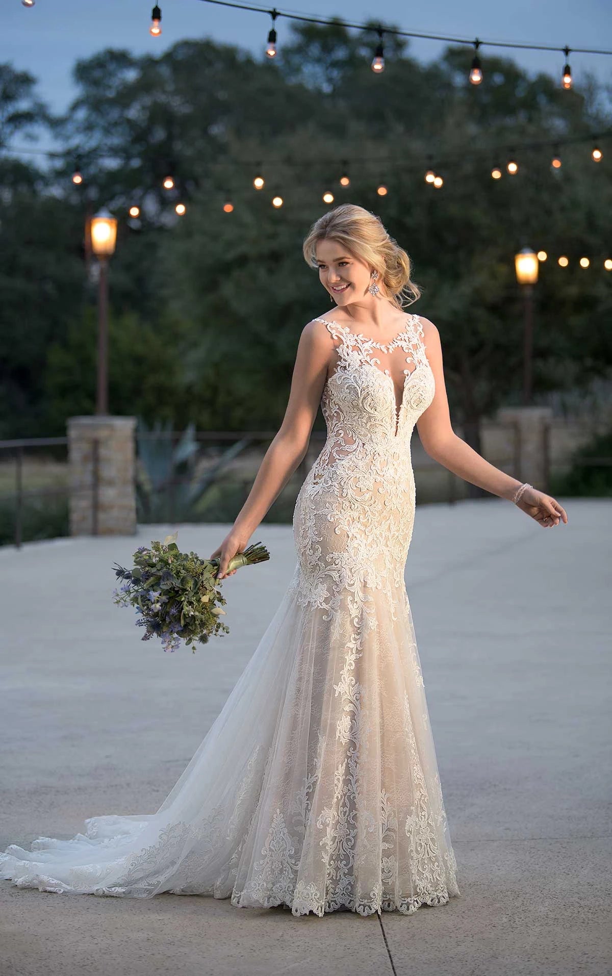 A completely bespoke design, this layered lace wedding dress with plunging V-neckline from Essense of Australia is oh-so dreamy. A high neckline with an organic-lace finish perfectly complements the plunging V-neckline of this bodice. Layers of cotton-style lace and French lace come together to create a soft, unique look that continues through the bodice and onto the skirt. Sheer cutouts adorn the sides of the gown, and extend into an open back. Bugle beadwork is placed throughout the gown to help create dimension. Large, lace motifs adorn the back of the skirt, which extends into a long, frothy train. The back of this layered lace wedding dress zips up beneath pearl buttons.