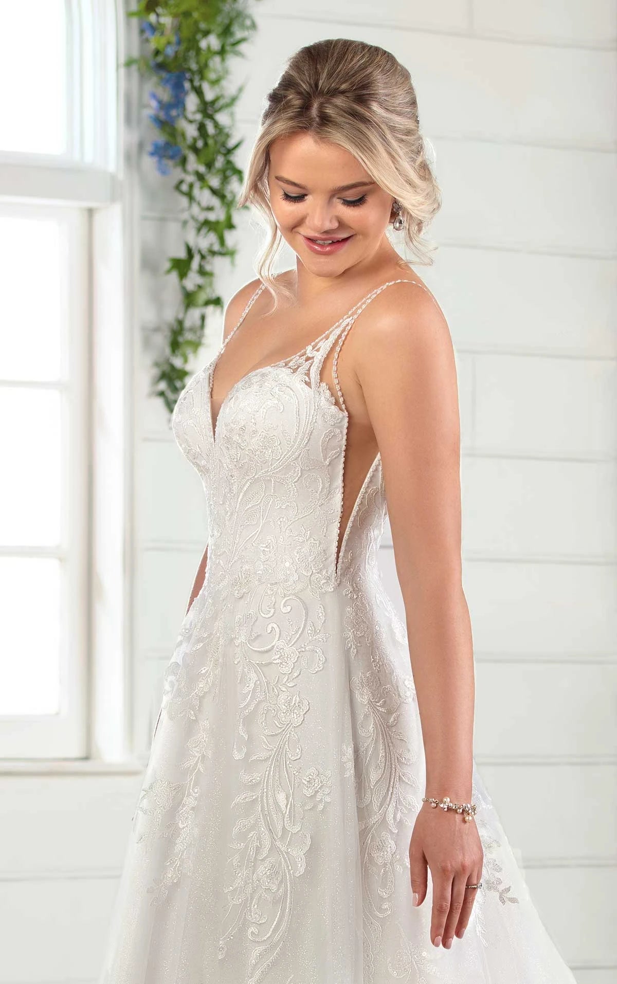 A young and fresh twist on traditional styling, this wedding dress from Essense of Australia is perfect for every blushing bride. A full lace hem amps up the classic styling of this gown, while a unique mix of graphic and floral laces are more concentrated in the bodice and grow in scale as they extend over the waistline and onto the full skirt. A clean, curved V-neckline is embellished with soft swiss dotting along the edges. Sheer paneling gradually widens as it frames the scooped open back detail, complementing the effortless full train below. This bridal gown is also available in plus sizes.