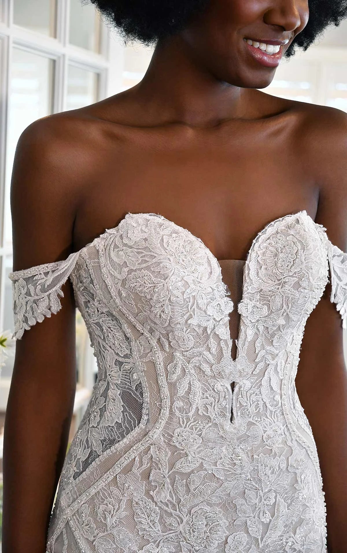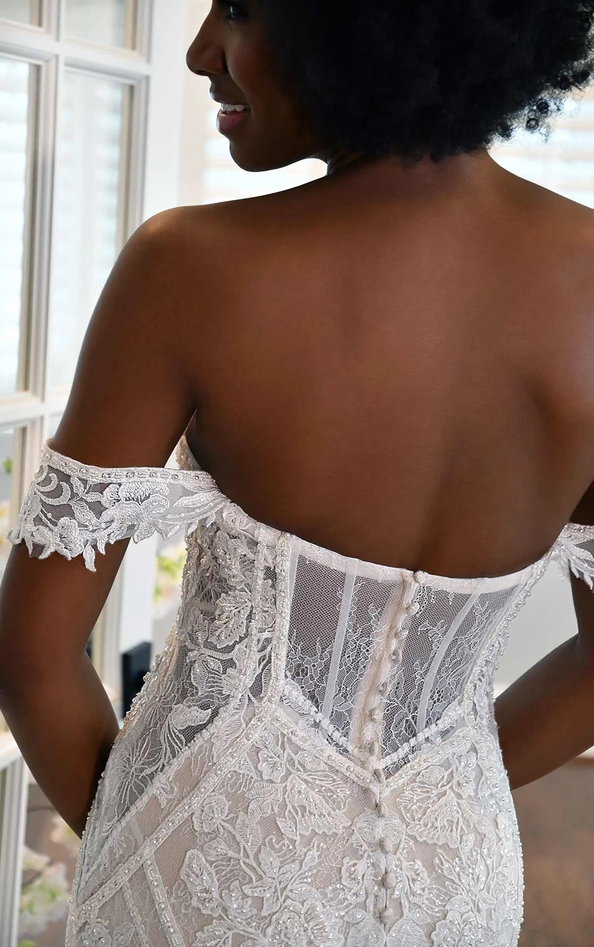 Style D3308 embraces the classic elements of bridal fashion with a silhouette made for today’s modern bride. Vintage-inspired lace patterns cover this bridal gown from head to toe, with striking linear curves and lines accentuating the body’s beautiful form. The plunging sweetheart neckline includes illusion tulle for a sexy look without sacrificing support. Encrusted beaded details on the bodice add a subtle shimmer, and along the sides and back of the bodice, a corset-inspired structure features sheer sexy cutouts. For a final bridal touch, fabric-covered buttons trail to the end of the stunning lace-adorned train. Easily styled for the traditional, modern or boho bride, this gown has a little bit of everything.