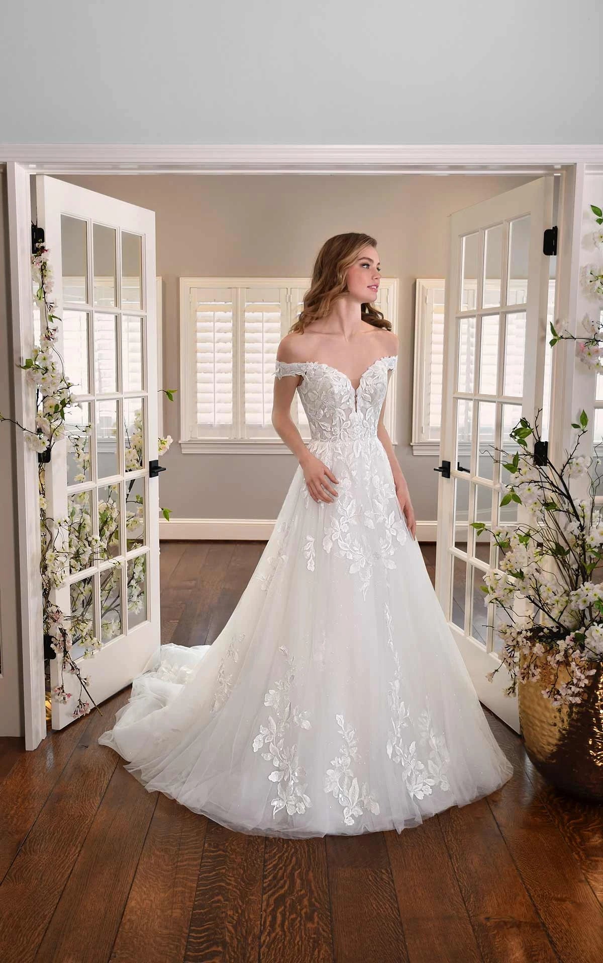 Style D3314 is classic bridal beauty in its finest form. Lovely nature-inspired lace adorns the bodice of this 1950s vintage wedding dress, from the plunging V-neckline to the perfectly placed off-the-shoulder straps. This gown ensures all-day comfort, with illusion tulle at the base of the neckline and elasticated straps that will easily move when lifting your arms. The slightly sheer bodice adds a touch of sexiness, perfectly complimenting the traditional ballgown skirt silhouette. The 1950's style wedding dress features a subtle V in the back, leading to classic fabric-covered buttons and lace appliques cascading down the skirt and train for a romantic, cohesive look. This gown is also available in plus sizes.