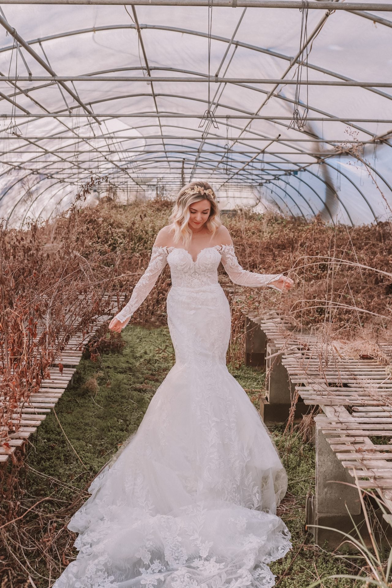For a truly classic look for the modern bride, Style D3315 takes the cake. With head-to-toe graphic lace encrusted with shimmering beadwork, this wedding dress is subtly sparkly and unforgettably elegant. The defined bustline is ornately decorated with swirling laces for an oh-so-glamorous look, and illusion tulle ensures that everything will stay in place all day long. A layer of chantilly lace underneath the top layer creates a textured, ultra-romantic look that shows an eye for style. The long sleeves give this an added vintage feel, with fabric-covered buttons at the cuff a true ode to classic bridal details. The fit-and-flare skirt has a real wow-factor, with layers and layers of tulle and lace creating a frothy, flowing skirt and lace-lined train.