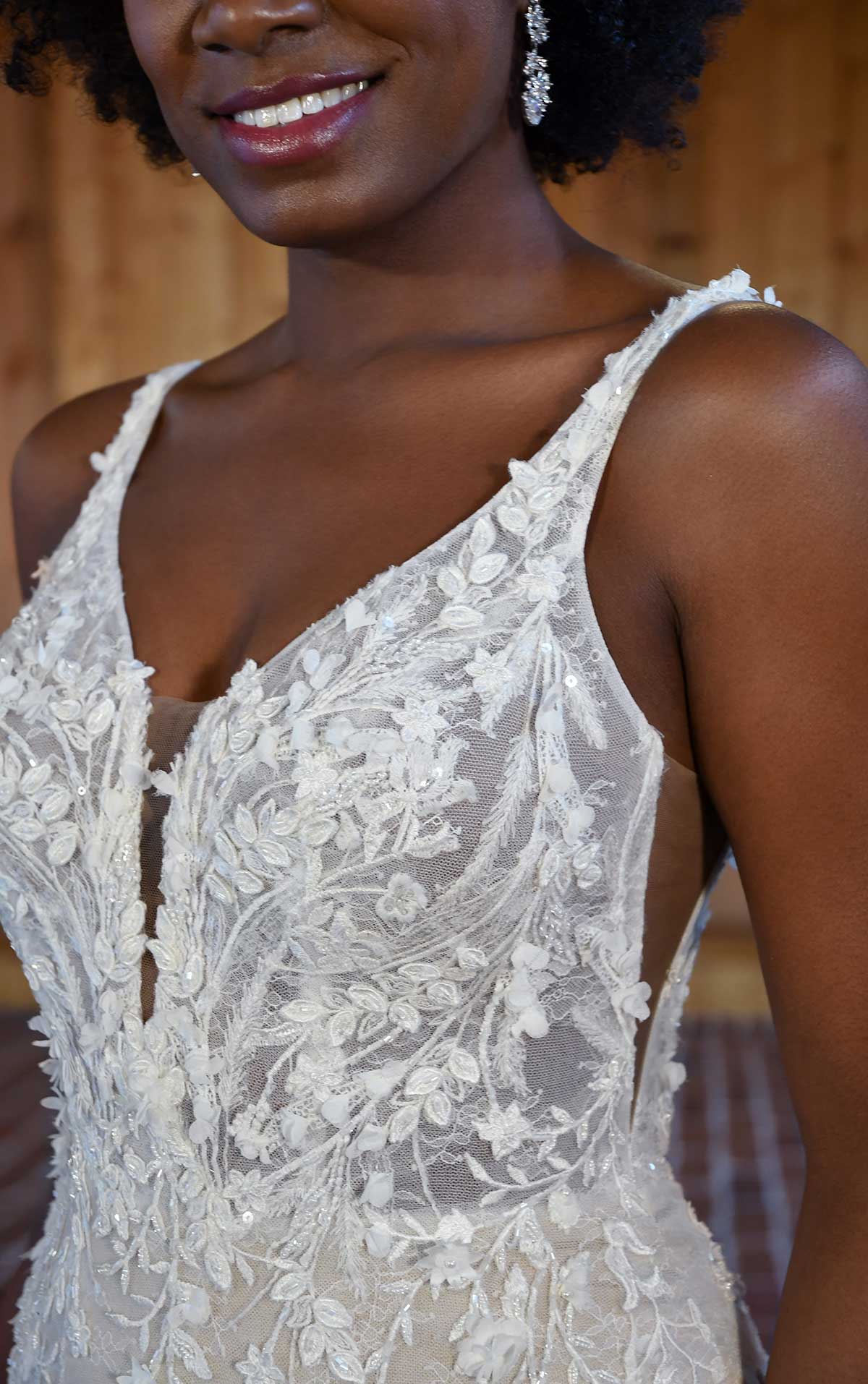 Prepare to turn heads in this stunning fit-and-flare wedding dress. Style D3335 strikes a balance between modern design and vintage-inspired appeal. From the elegant shoulder straps and sexy plunging neckline to the intricate 3D floral details and sparkling sequins, this gorgeous gown truly shines from every angle. It features side bodice cutouts with illusion tulle that add just the right touch of demure sophistication. The bodice scoops into a low open back and follows the fitted hourglass form to meet with dreamy tulle gussets for a voluminous flared skirt. For the final ethereal touch, layers of gauzy tulle effortlessly float down the aisle in dramatic and romantic fashion