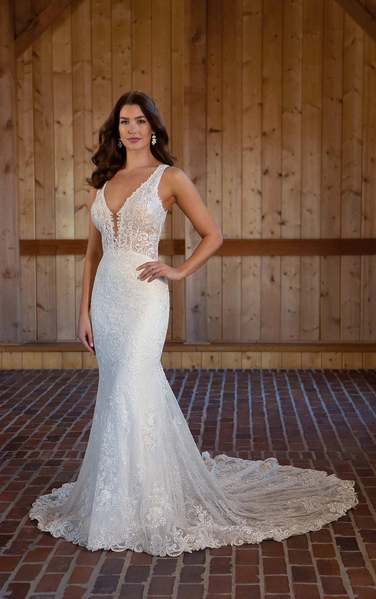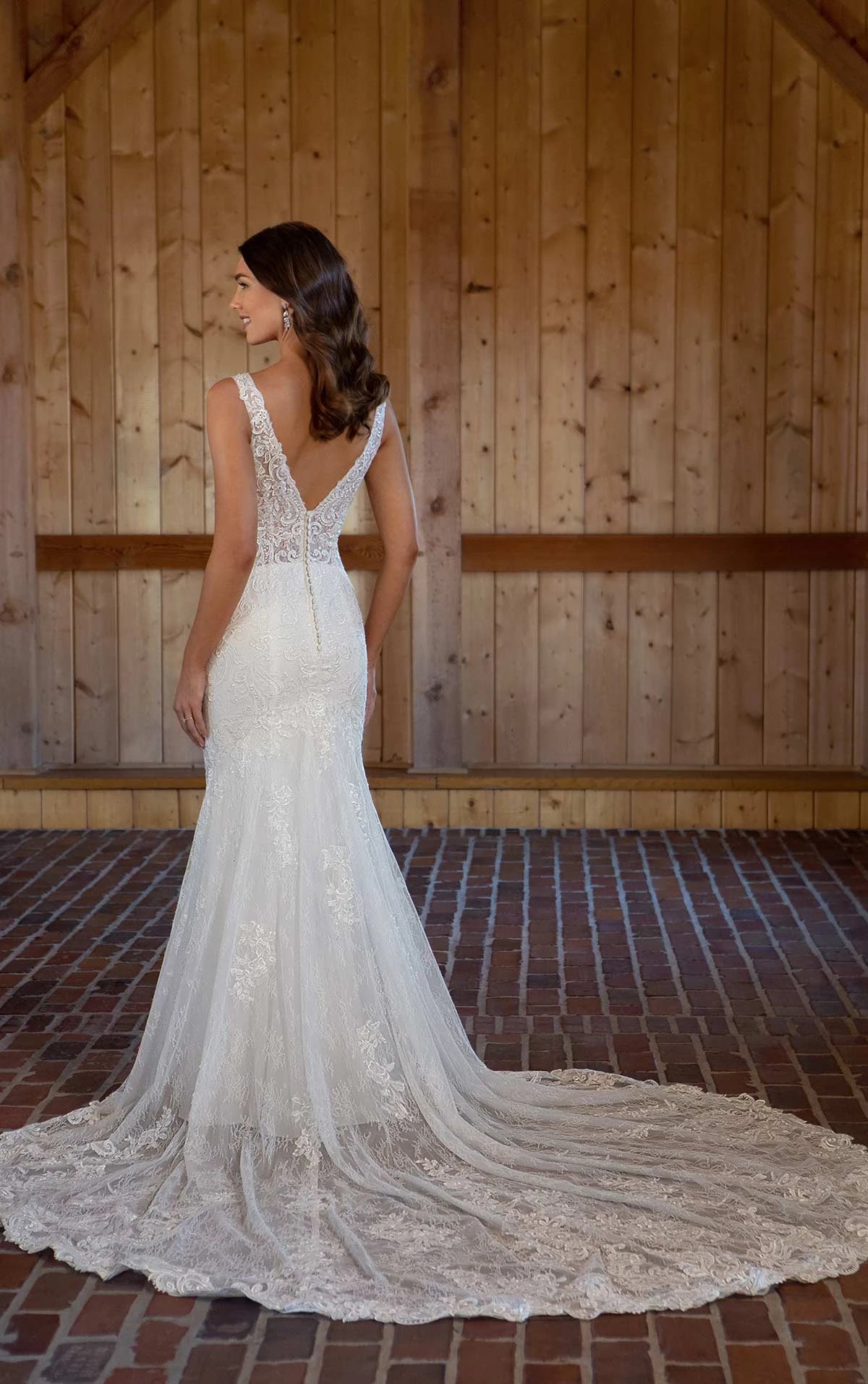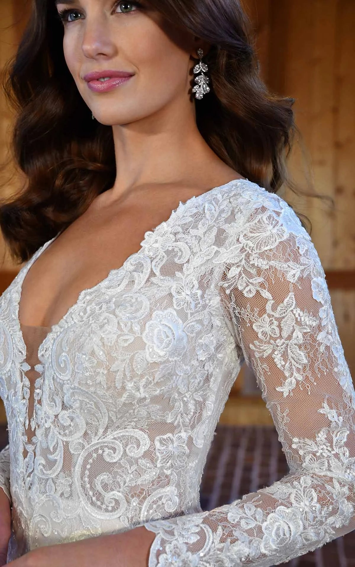 Timeless beauty and elegance meet in Style D3363, a vintage-inspired lace wedding dress that was made for the classic romantic. Elegant shoulder straps fuse with sheer floral lace sleeves while the plunging illusion neckline adds a modern sexy allure. In the back, a deep V-shaped open back is framed by sheer lace and accented by fabric-covered buttons down the center. In a gorgeous mix of graphic and chantilly lace, the body-skimming column silhouette unfolds into a breathtakingly romantic lace train.