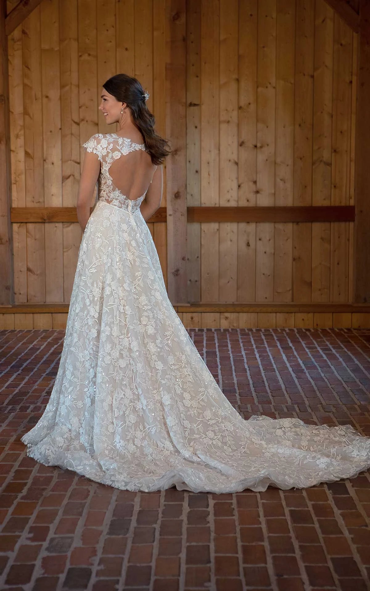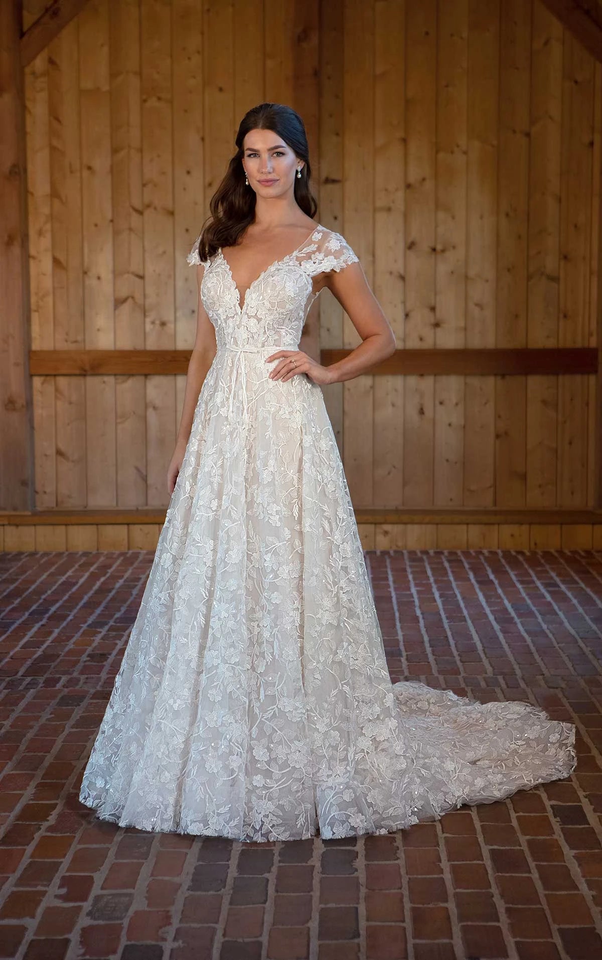 Sweet, sophisticated and ever so lovely, Style D3487 has an effortlessly charming appeal. From the dainty lace cap sleeves that swoop into a plunging neckline to the simple elegant bow detail at the waist, each feature radiates a graceful and effortless beauty befitting for a timeless romance. The back bodice opens into a peekaboo open back detail framed in delicate florals, and the romantic allover lace flatters the figure in a classic A-line silhouette. From the first look to the first dance, this gown enchants in its romantic elegance.