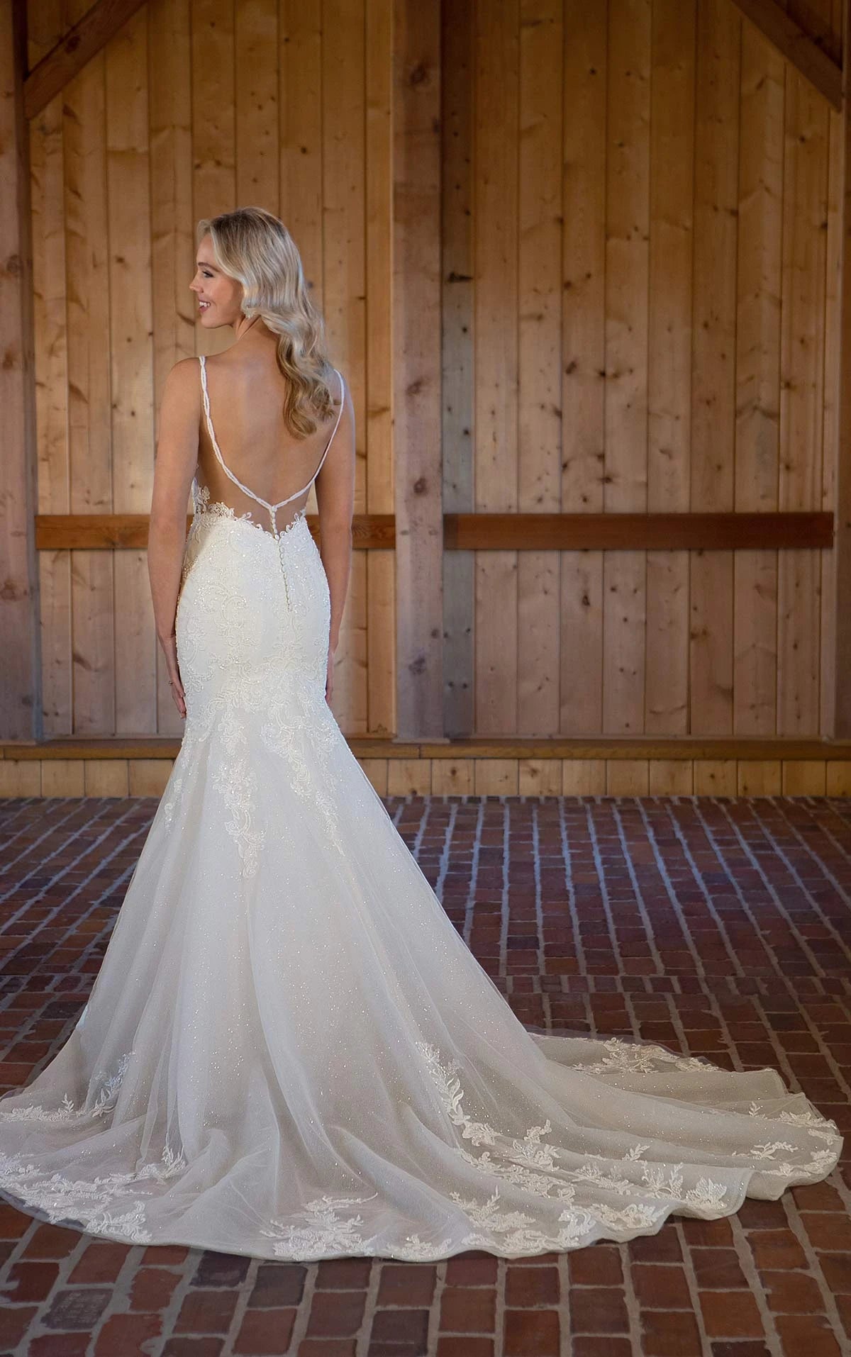 The beauty is in more than just the details with Style D3502.The gorgeous beaded spaghetti straps gently twist and drape from the sexy sweetheart neckline to the dramatic illusion back. Sparkling sequined lace showcases the flattering fit-and-flare design, featuring hand-placed lace appliques to accentuate the body’s contours. With the fluted and flared horsehair hem, this lovely wedding dress finishes with a glamorous train for a show-stopping look that will turn heads on and off the aisle.