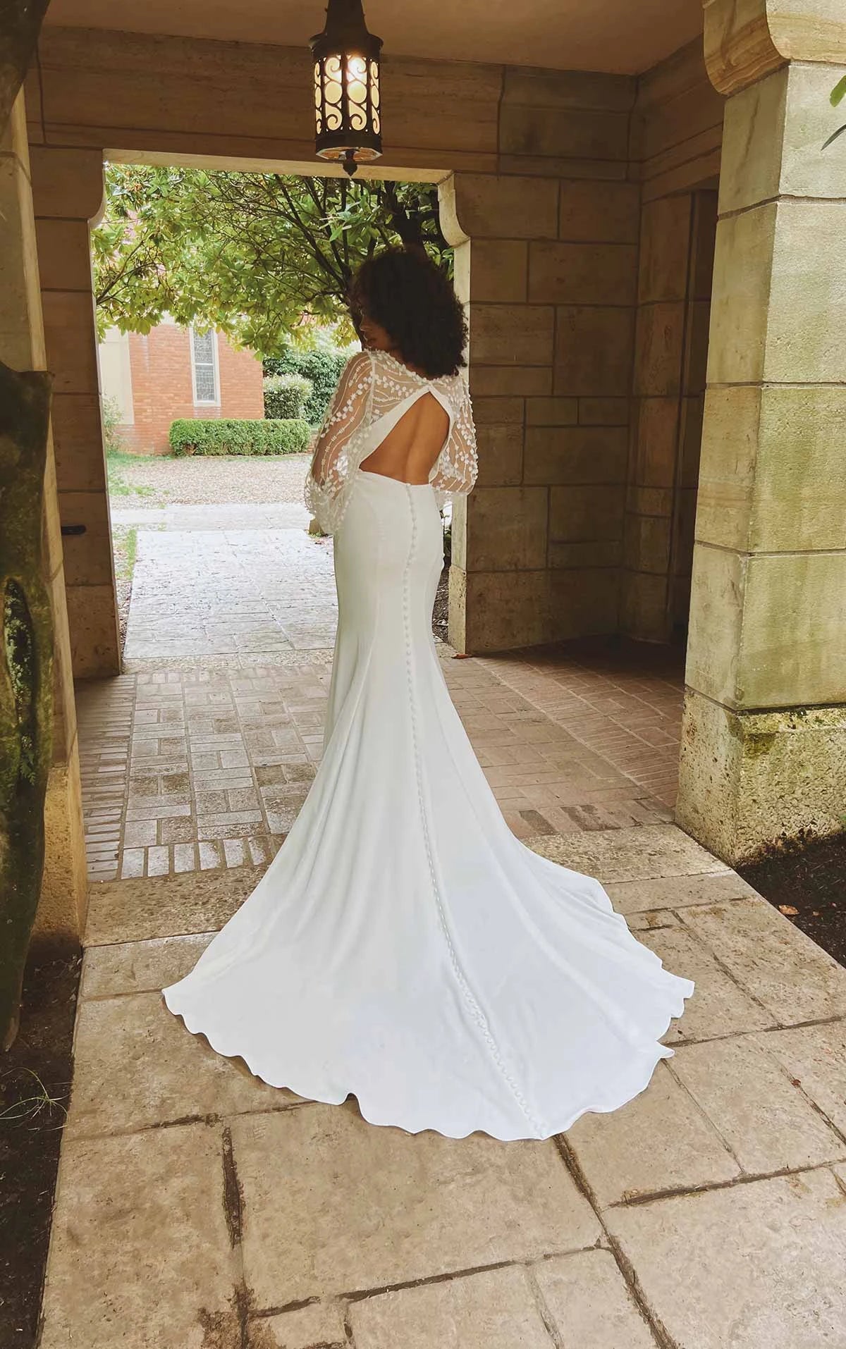 Sheer sophistication radiates from this modern boho wedding dress. From its chic blouson sleeves adorned in 3D floral accents, to the plunging deep V-neckline adding architectural angles and impeccably crafted design. The sleek column silhouette is accentuated by the dramatic open back full long blouson sleeves to the silhouette-hugging skirt. The back opens into a free-spirited and fashion-forward look before meeting a meticulous row of fabric-covered buttons to the edge of the train. Perfectly sculpted from luxurious cotton crepe, Style D3563's sheath silhouette gently cascades away from the body to form a sweeping train that will glide down the aisle.