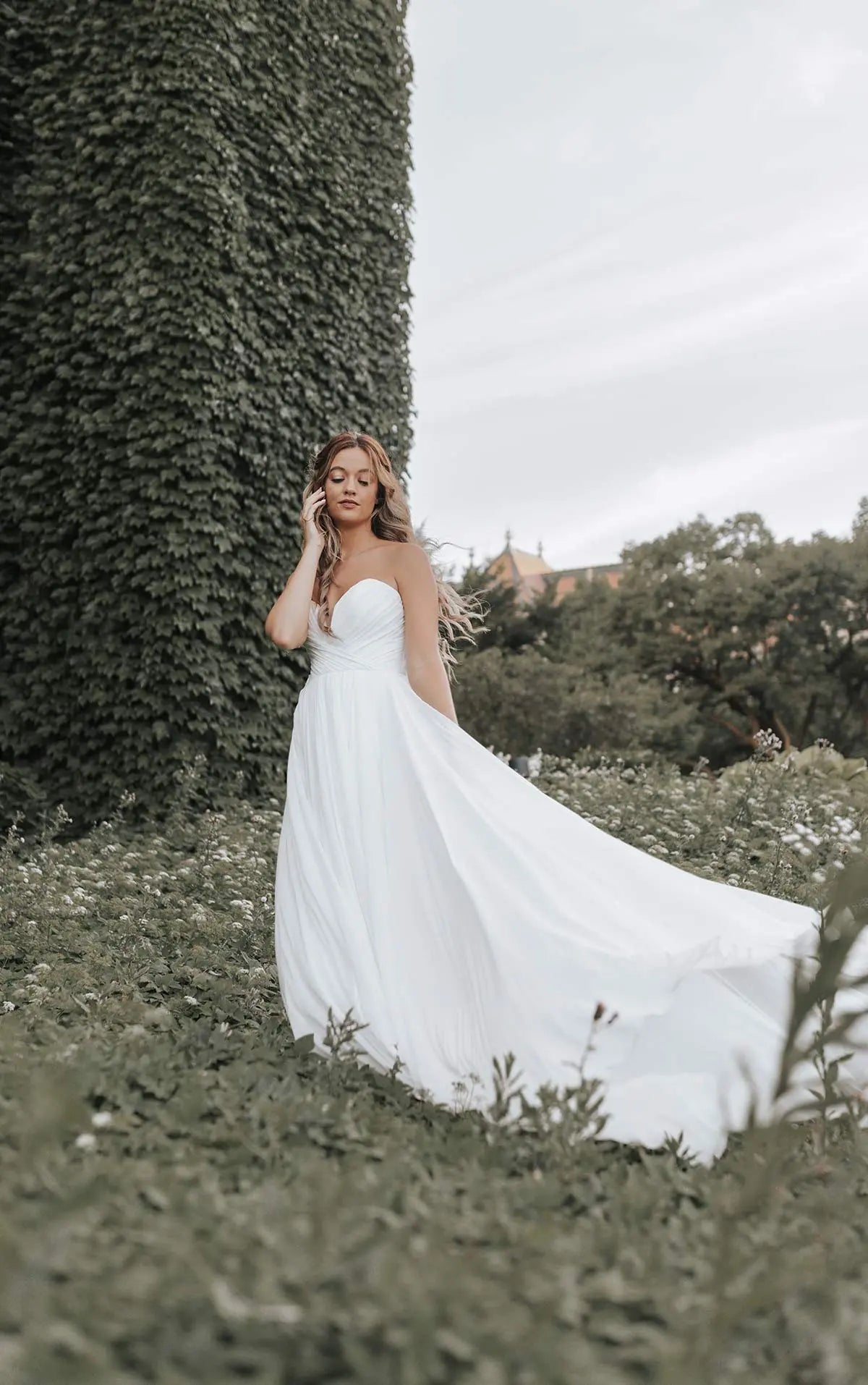 Get swept away in Style D3636, a romantic A-line wedding dress draped in soft layers of delicate chiffon. The notched plunging neckline accentuates the soft pleating of the romantic wrapped bodice. Detachable off-the-shoulder blouson sleeves add a luxe detail for this versatile wedding look, which can also be worn strapless. The clean and simple aesthetic is made complete with a soft A-line skirt that floats and sways with every movement, with a side slit detail and head-turning train. This wedding gown is also available in plus sizes.