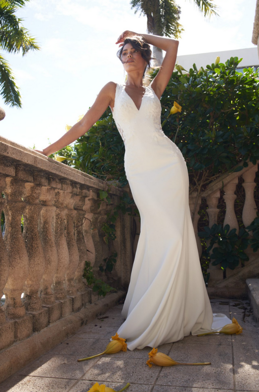 Style D3544 is a memorable, runway-worthy wedding dress for the most glamorous bride. A classic front bodice is framed with wide shoulder straps and a flattering deep V-neckline adorned with artfully-placed embroidered lace applique and just the right touch of beaded sparkle. Accentuating the hourglass figure, deep side cutouts hug the waist with sheer lace to open to an illusion back of floating tattoo florals and an elegant strand of fabric-covered buttons that embellish the full length of this sexy column gown. In modern luxe style, the chic body-skimming fabric drapes into a soft sweeping train with a touch of organic lace trim for the final finishing detail.