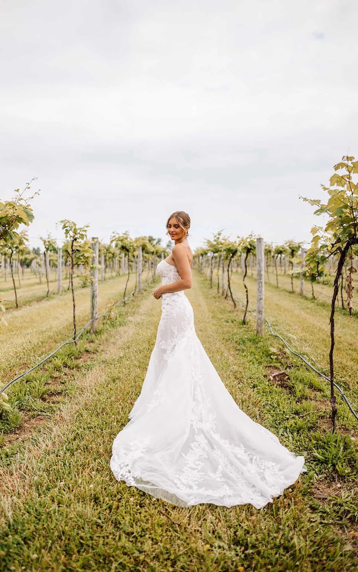 An allover lace masterpiece, Style D3647 sparkles with the beauty and luxury of a designer wedding dress. The strapless sweetheart neckline of the sheer bodice highlights the architectural corsetry, combining Old World romance with contemporary linear fashion design. The illusion tulle back with exposed boning and a single row of fabric-covered buttons highlights the bodice even further for a timeless appeal. Expertly-placed sparkling lace appliqués scroll throughout the fit-and-flare skirt before flaring into a gauzy dream-like train with lace accents to complete this picturesque bridal look.