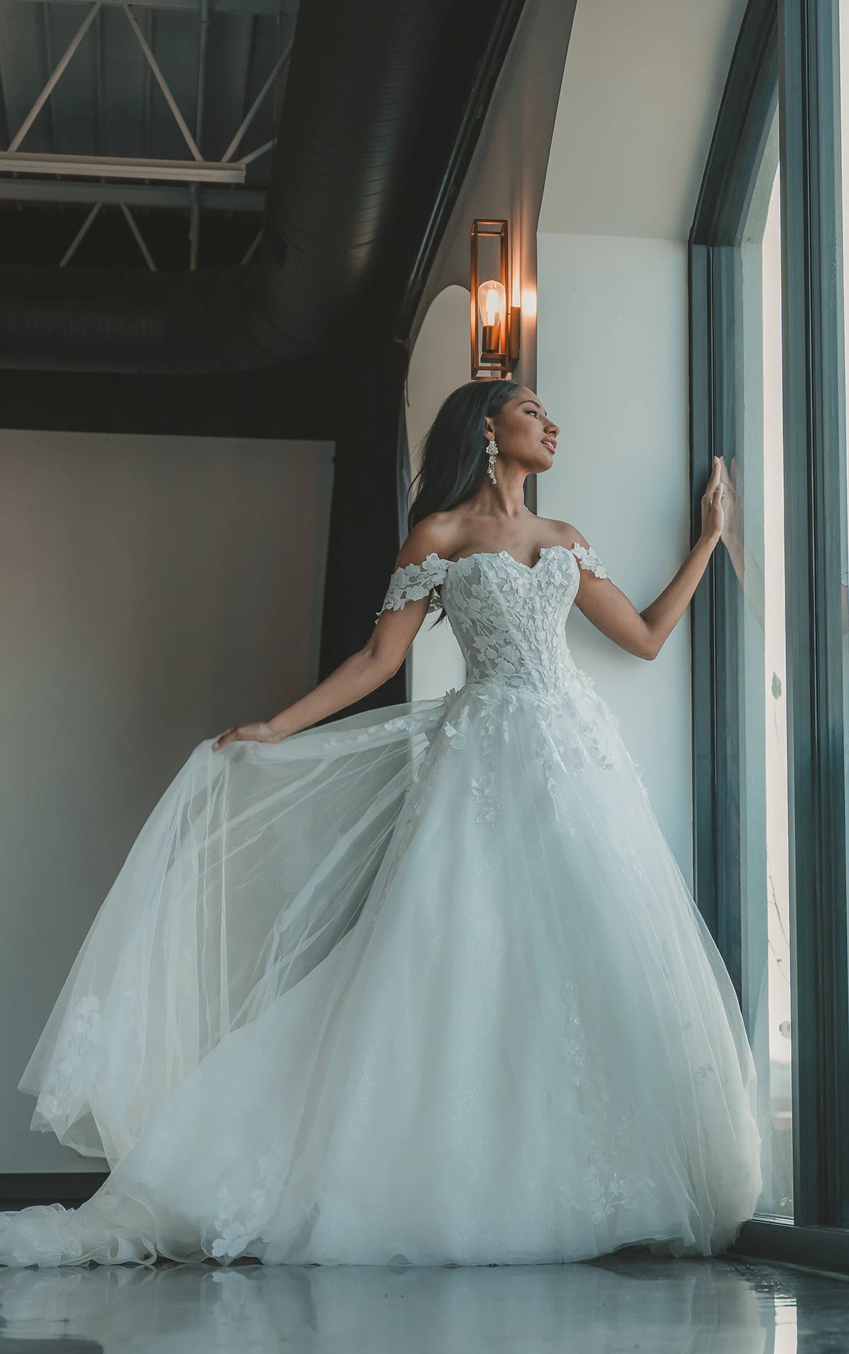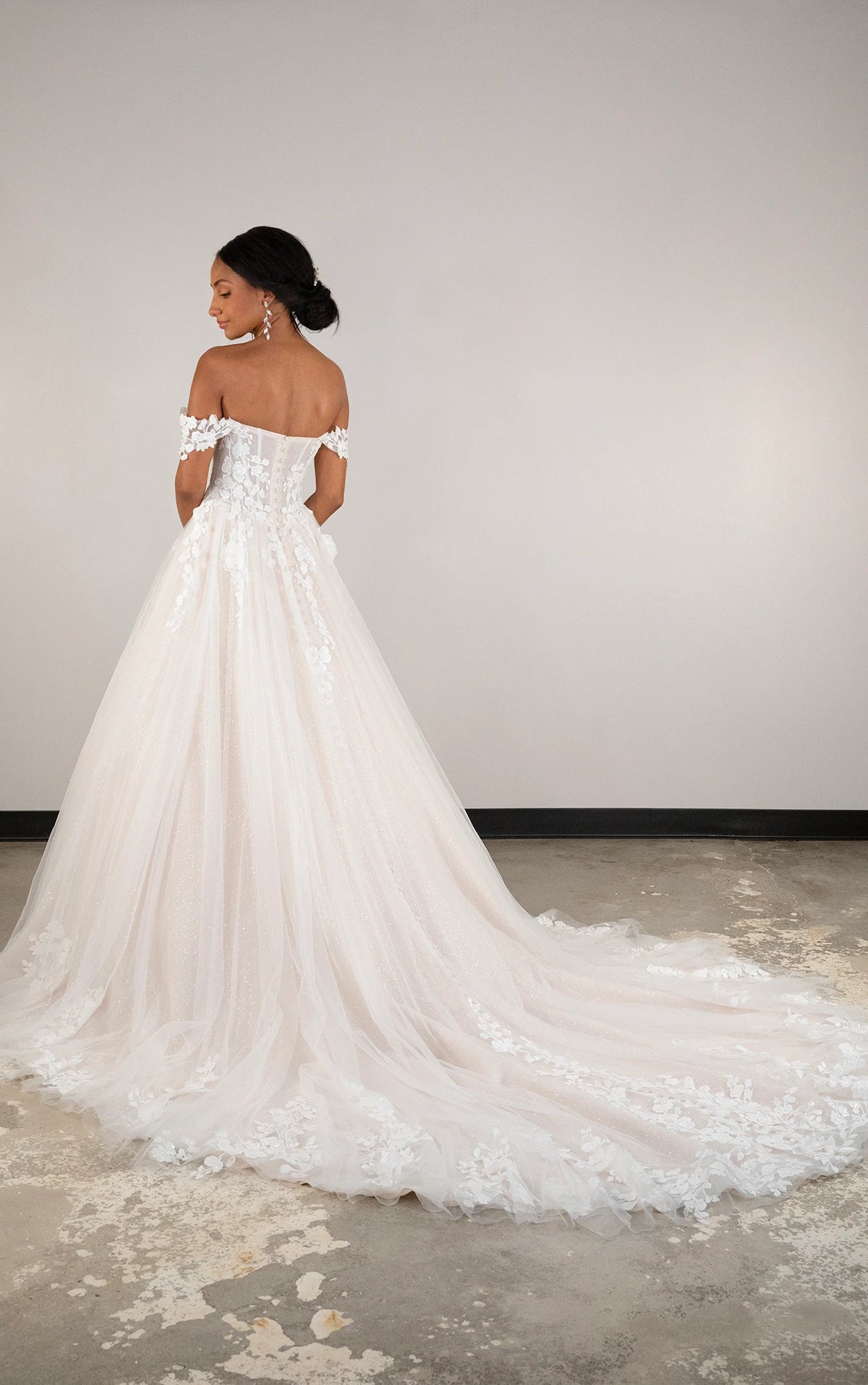 More is more in the extravagant Style D4106—a romantic princess-inspired wedding gown in delicate lace and optional glittering tulle. Lacy off-the-shoulder straps attach to a traditional sweetheart neckline and easily detach to transform this wedding dress into a strapless ballgown in moments. The corset bodice, offered in lined and unlined options for varied sheerness, features floral lace tendrils that melt past the gathered Basque waistline and reappear at the hem of the full, glittering ballgown skirt. This enchanting, ethereal princess wedding gown epitomizes happily-ever-after fashion for the modern princess bride, and is also available in plus sizes.