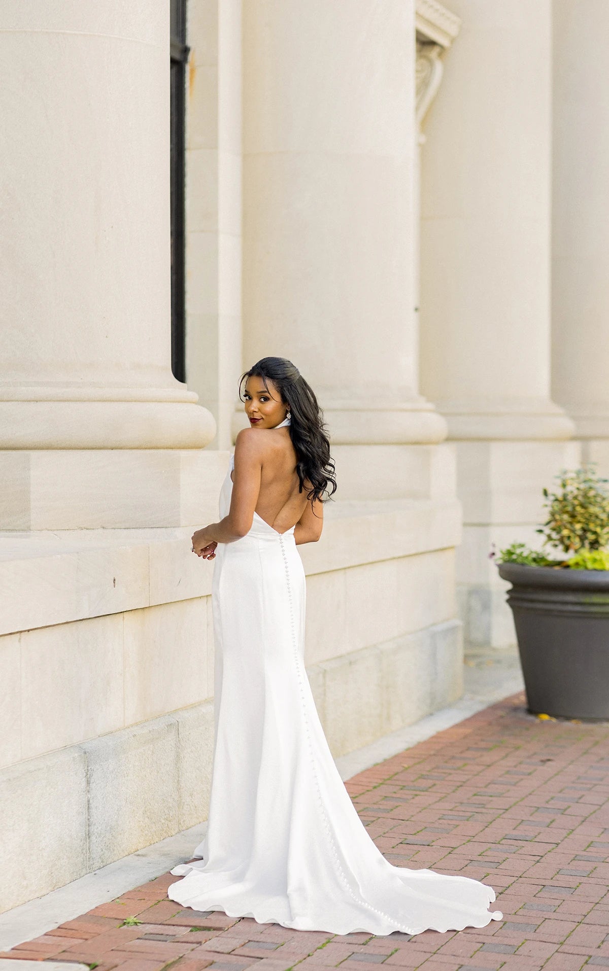 Luxe simplicity meets timeless elegance in Style D4123, a sexy halter wedding gown for the bride with refined style. A sophisticated draped halter neckline wraps the neck and folds into the tailored bodice before revealing a dramatic open back that meets the waistline. The fitted column silhouette hugs the figure with flattering seam work before gracefully extending into a soft sweeping train. Lined with timeless pearl buttons down the back, this high-neck, low-back wedding dress is ready for the runway and the aisle.