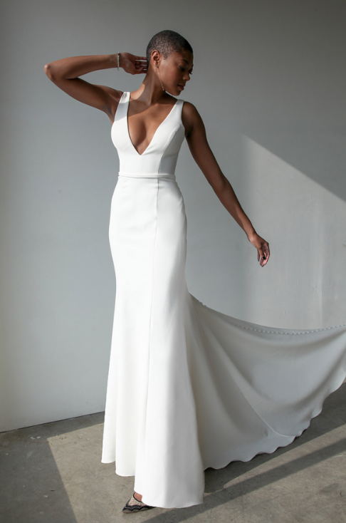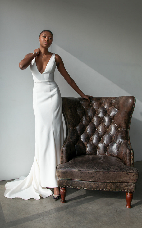 Style D3576 is a sleek and sophisticated wedding dress made for the modern minimalist. Featuring a sexy plunging neckline, flattering wide-set straps, subtle seaming and a form-fitting column silhouette, this wedding gown is effortlessly elegant from every angle. The low V-shape in the back highlights the figure, while delicate fabric-covered buttons line the skirt for a stunning finishing touch.