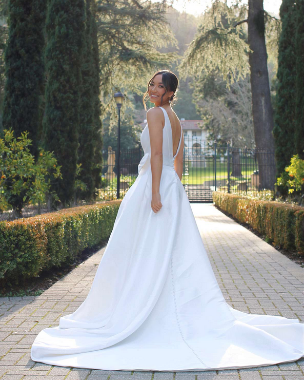 Style D3586 exudes an elegant minimalism—making it the ideal match for a modern bride. Graceful shoulder straps plunge into a deep V-neckline for a subtle and sexy allure while in the back bodice, a complementing deep V-back joins the strand of fabric-covered buttons that will adorn the full length of this gorgeous gown. Graceful line seaming shapes the tapered waist for a chic A-line silhouette in crisp matte Mikado and discreet pockets add a functional luxury. To elevate this simple and glamorous gown even more, a detachable asymmetrical bow detail and a slit in the skirt complete this fashion-forward look. This wedding dress is also available in plus sizes.