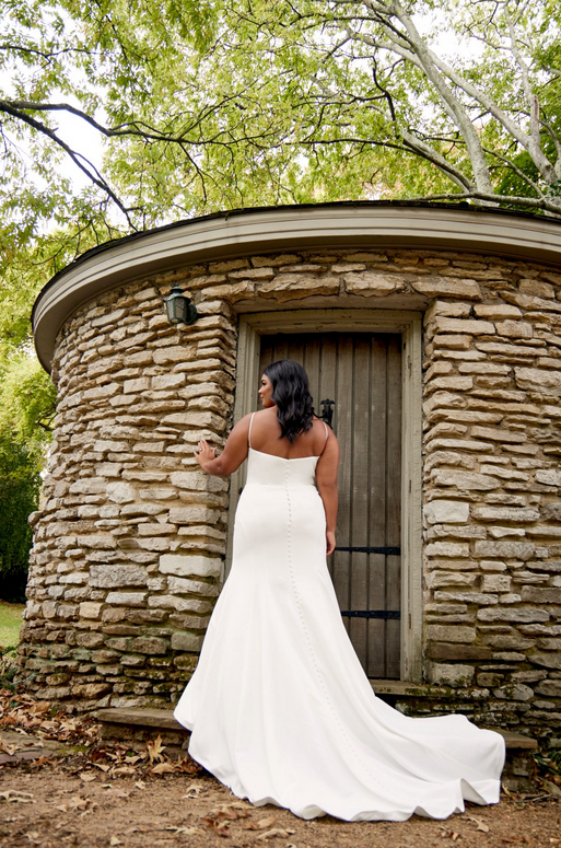Chic and simple meet sleek and fashionable in this plus size fit-and-flare wedding dress. Style D3615 lets the bride shine, as this matte satin gown begins with slim spaghetti straps to grace the shoulders and a gently scooped neckline with an illusion tulle notched detail for a modern touch. The double seaming in the skirt create a flattering figure before flaring out into a full skirt and train. The opulence lies in its impeccable designer construction and clean design—a look of pure contemporary elegance.