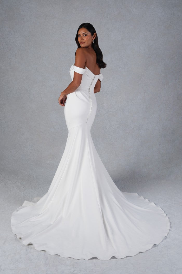 Off the shoulder stretch crepe fit and flare with cowl neckline overtop of a sweetheart neckline. Bodice detailed with couture seaming that is met with asymmetric ruching on skirt. Finished with jersey lining, crepe covered buttons on back, and chapel length train.