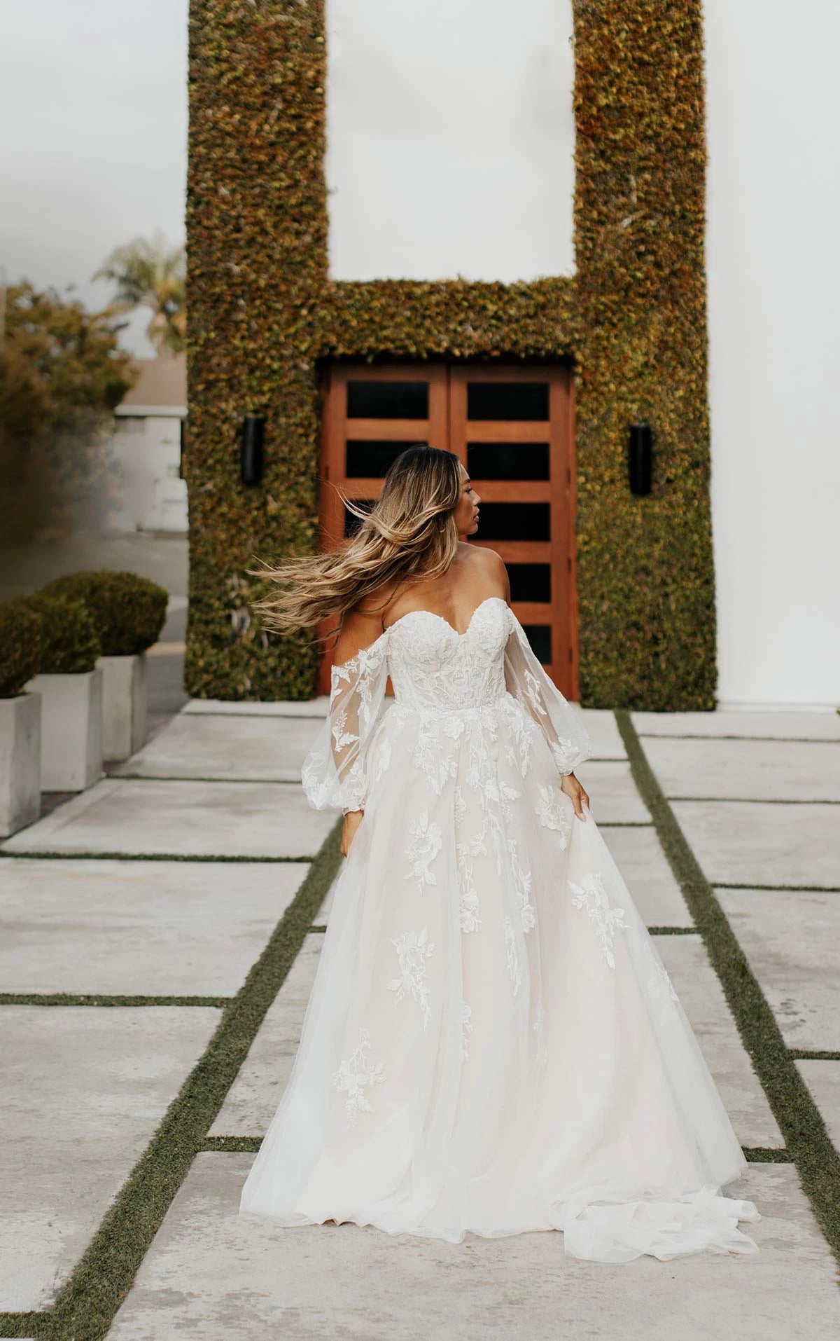 Style 7521 pairs windswept romantic style with dreamy boho design in this one-of-a-kind wedding dress. An allover matte lace accentuates the sweetheart neckline of the bodice with a semi-sheer construction that shows off its sexy modern symmetrical design. The free-spirited blouson sleeves highlight the botanical details of the lace and cuff at the wrist in exquisite floral fashion. For a versatile, fall wedding look, the sheer statement off-the-shoulder sleeves detach at the bodice to complement or emphasize the swirling lace appliques dancing between the layers of frothy tulle in the soft A-line skirt. This wedding gown is also available in plus sizes.