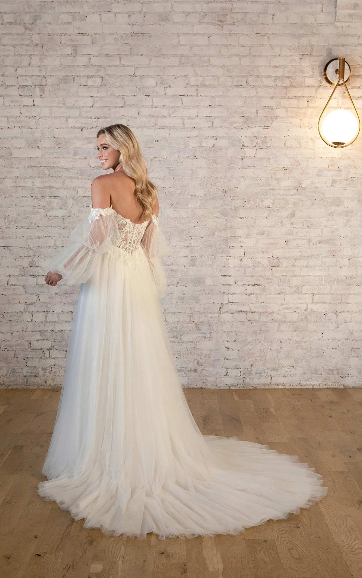 This whimsical wedding dress defines romantic bridal style for the free-spirited bride. Style 7573’s corset-style boning of the allover lace bodice brings an Old World charm, while the sexy plunging neckline adds an element of modern elegance, highlighting the edges with its large organic floral lace. Seamlessly joined at the straight across neckline are sheer detachable off-the-shoulder long tulle sleeves to add to the sweeping romantic charm that comes into full effect with an ethereal tulle skirt that dances with every movement. This boho wedding gown is available in plus sizes.