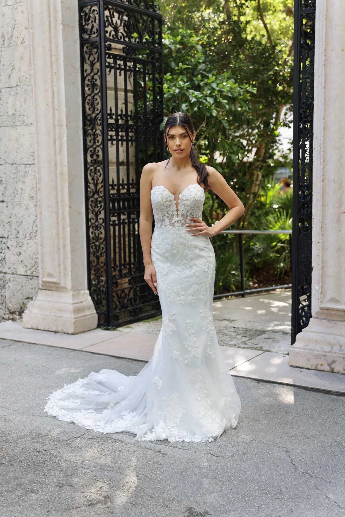 For the fashion-forward bride who believes more is more, Style 7736 brings every romantic bridal element to life with perfect restraint. A strapless sweetheart bodice plunges into an illusion tulle-lined neckline, revealing the sheerness of the gorgeous floral lace. Designer construction adds an exceptional fit to this fit-and-flare silhouette: skimming every curve and highlighting the natural figure before flaring past the hip into a trumpeted train adorned in floral lace accents. Glimmering beneath romantic florals, glitter tulle and sequin accents add a touch of sparkle to complete this unforgettable wedding dress.