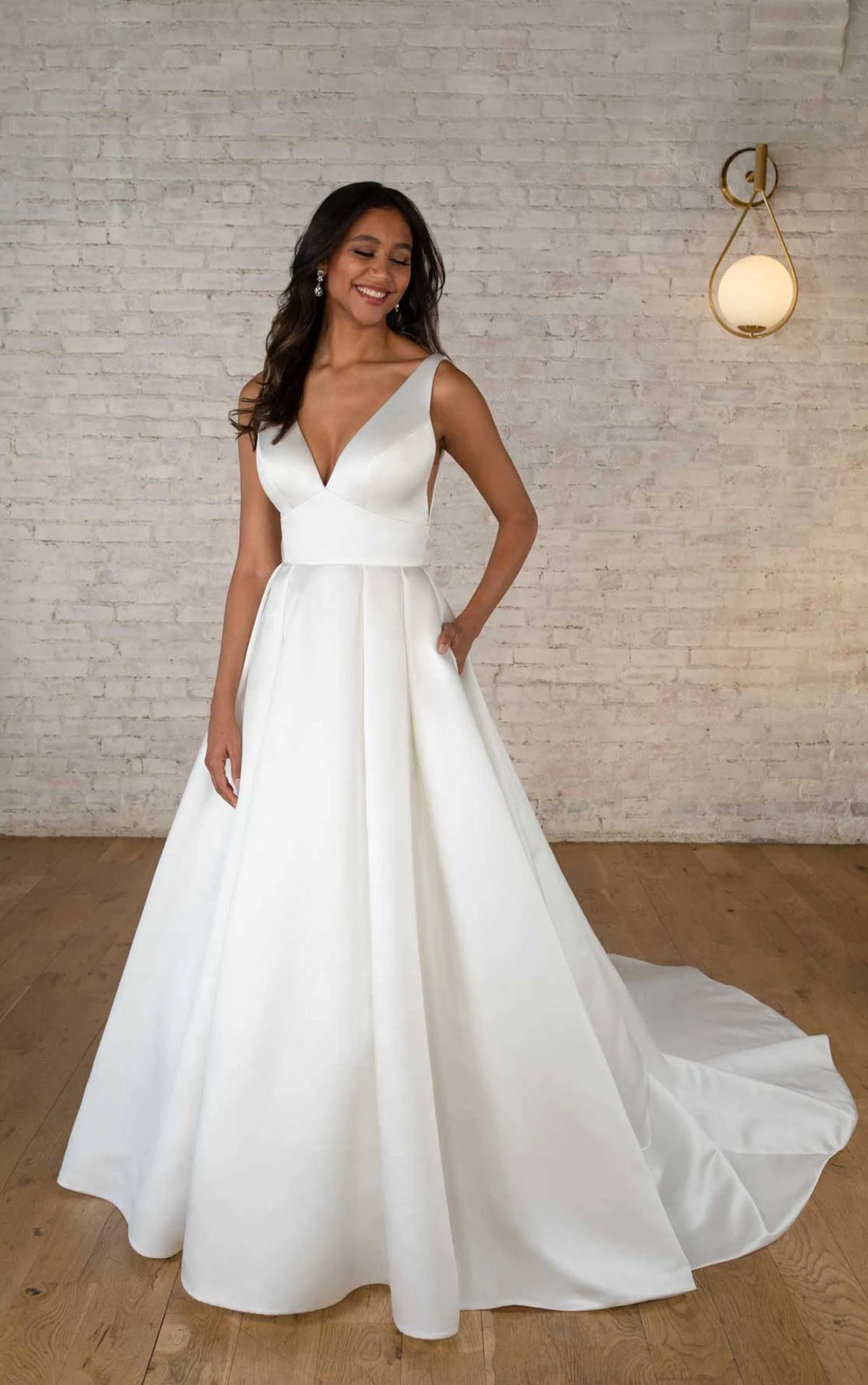 Bold and chic, Style 7755 radiates with its lustrous satin construction and impeccable ballgown silhouette. From sleek shoulder straps, a flattering deep V-neckline dips into a fitted banded waistline. In the back, a complementary V-back detail meets the waistline and adds a row of fabric-covered buttons to accentuate the full length of this modern wedding gown. From the tailored waist, a regal ballgown skirt extends to form a sweeping cathedral train at its finish. For the daring modern bride, this wedding dress makes a statement down the aisle.