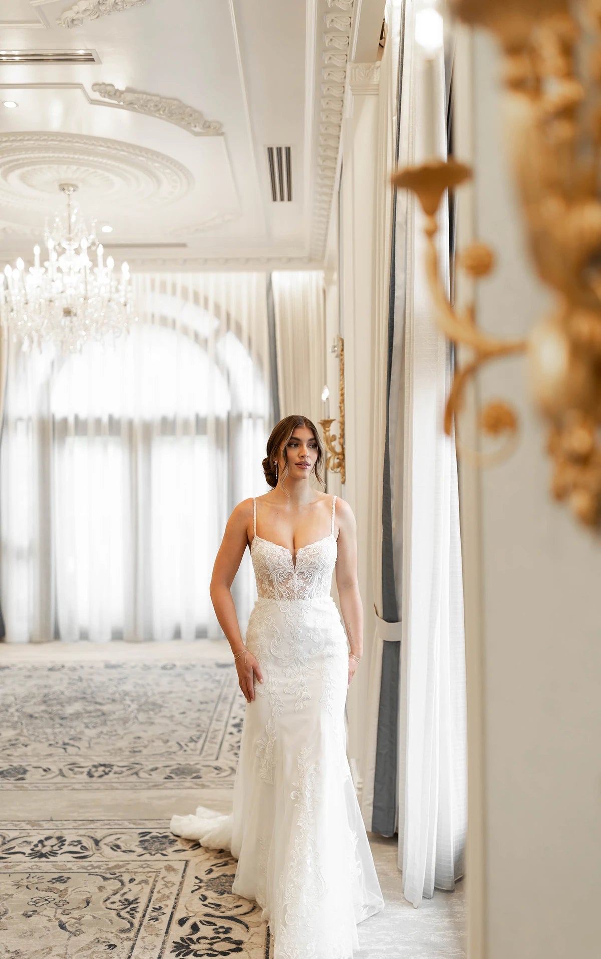 Sparkle with every step in Style 7863, a modern sweetheart lace wedding dress with gorgeous embellished details throughout. Glittering beaded spaghetti straps frame the modern notched sweetheart neckline in an impeccably fitted bodice that comes modestly lined or unlined and sheer. Scrolling lace motifs join the bodice to the curve-hugging fit-and-flare skirt, cascading down the silhouette before meeting weightless fluttering layers of tulle. From the first look to the last dance, this sparkly fit-and-flare wedding dress is the perfect complement to the modern bride.