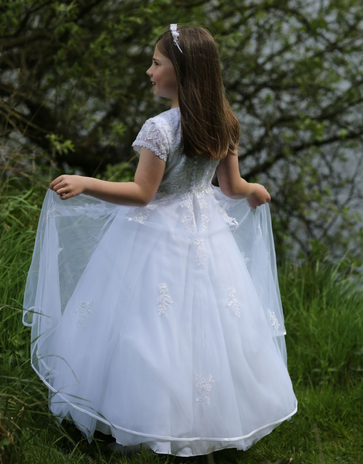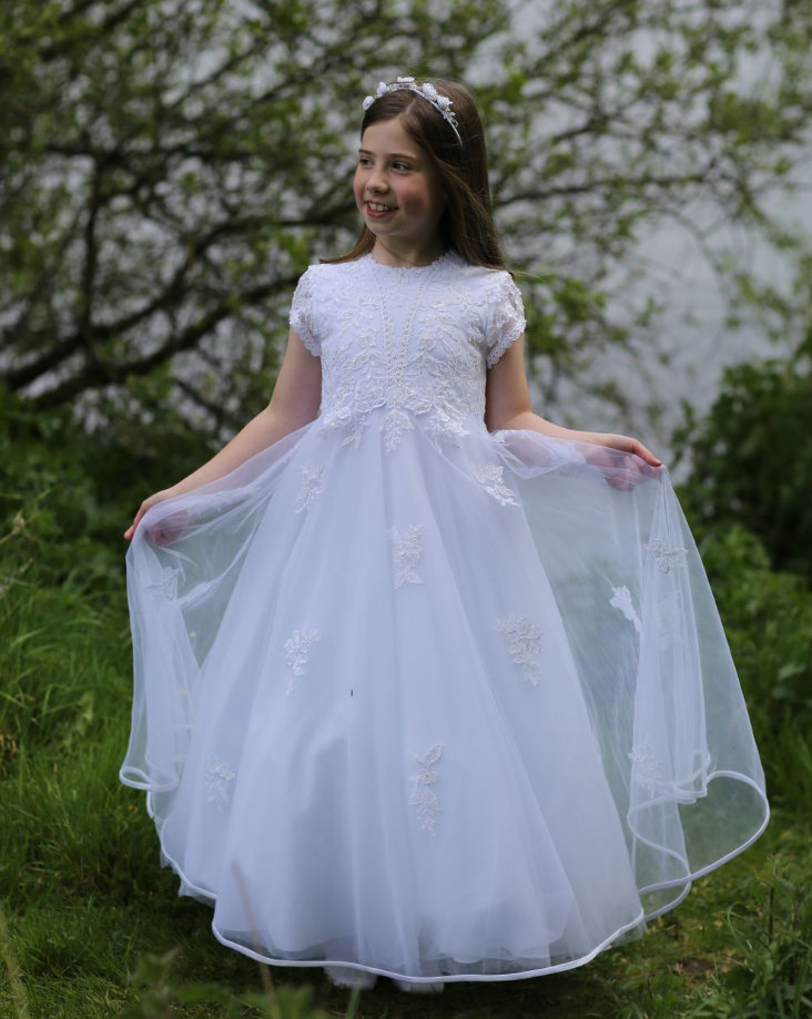 Celebrate her special day with the timeless elegance of the Harmony Communion Dress. Crafted by Celebrations, this exquisite gown features a delicate lace bodice, cascading into a soft, flowing skirt that embodies grace and charm. The intricate detailing on the cap sleeves and the subtle embellishments make this dress a stunning choice for a First Communion or any formal occasion.