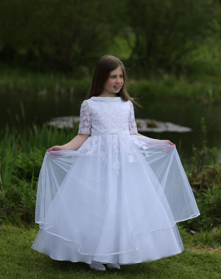 Celebrate her special day with the timeless elegance of the Kahili Communion Dress. Crafted by Celebrations, this exquisite gown features a delicate lace bodice, cascading into a soft, flowing skirt that embodies grace and charm. The intricate detailing on the cap sleeves and the subtle embellishments make this dress a stunning choice for a First Communion or any formal occasion.
